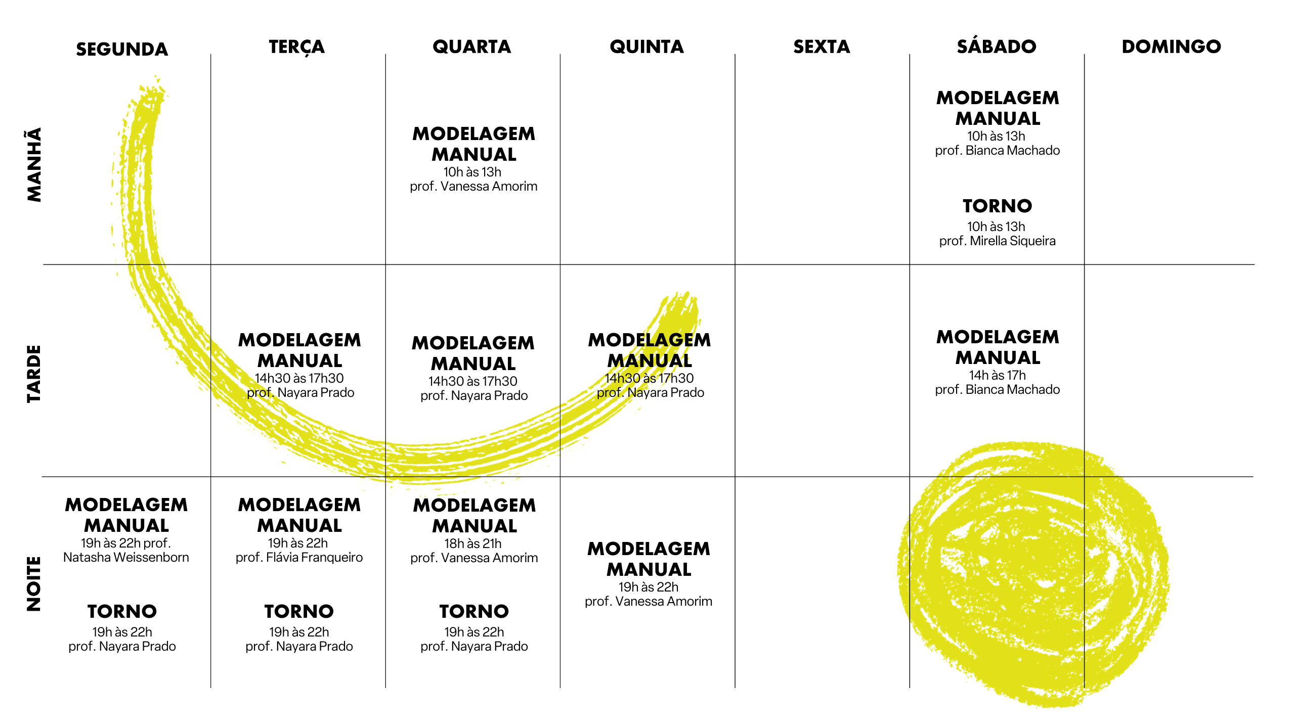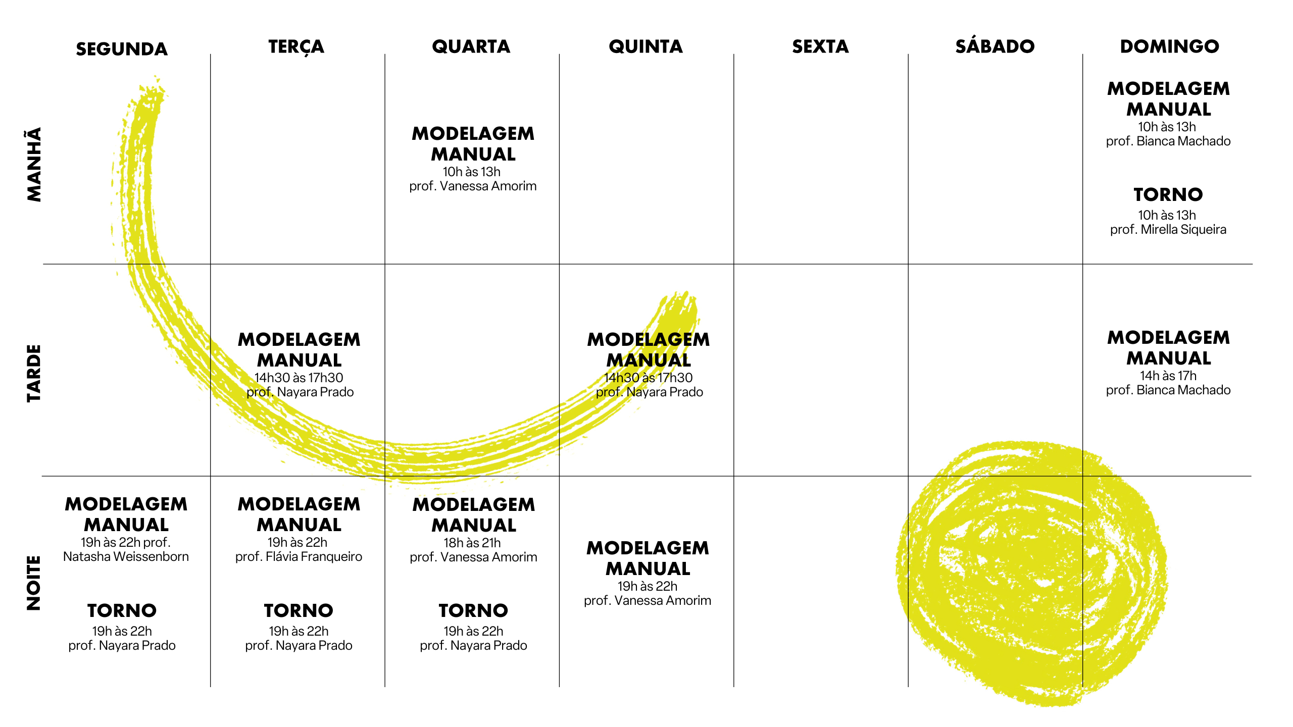 As aulas regulares são semanais (1x por semana) e, todo mês, você tem direito a 3kg de argila, já incluindo a queima e a esmaltação. Nossas turmas são dividas entre Modelagem Manual e Torno Elétrico, então é preciso selecionar a sua área de interesse - mas, havendo disponibilidade na mesa de modelagem ou no torno, pode ser utilizado. Além disso, nas aulas você tem acesso a todas as facilidades da escola: plaqueira, extrusora, vários modelos de moldes e diversas ferramentas.